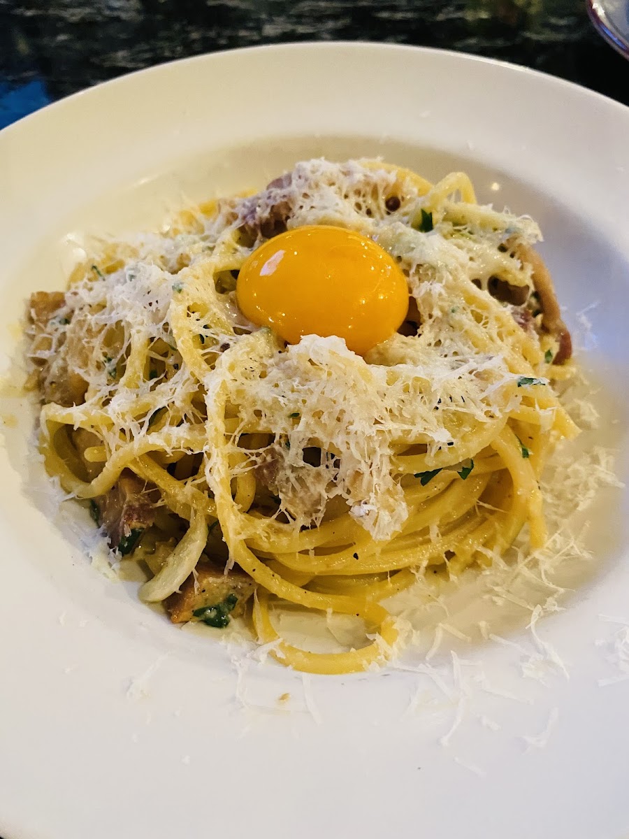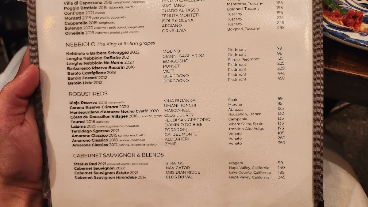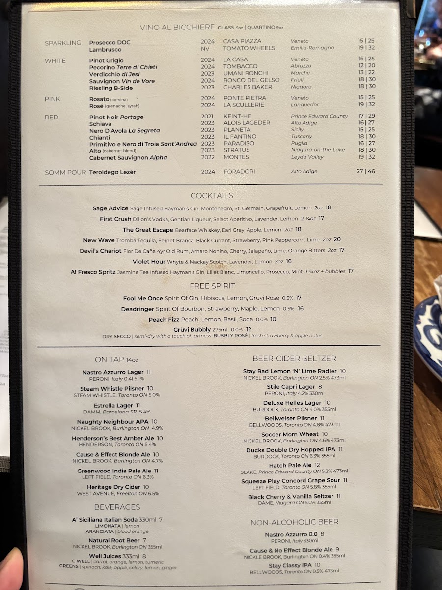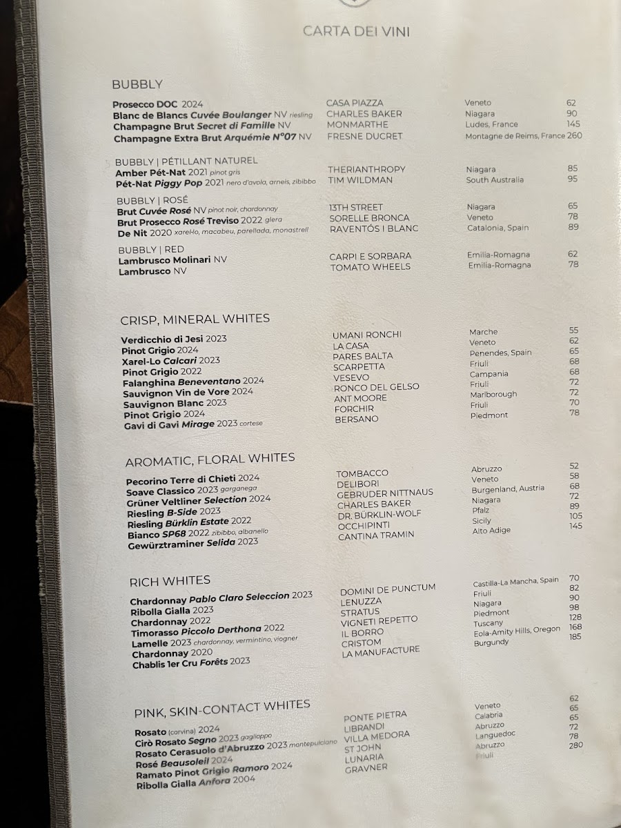 The menu is a treasure trove for pasta lovers, featuring dishes like the Linguine Di Mare—an oceanic delight with white shrimp, Hokkaido scallops, and little neck clams floating in a sumptuous tomato brodo, all for CA$30.00. If you're seeking something heartier, the Chitarra Alla Carbonara, rich with guanciale, Conestoga Farms yolk, and a touch of black pepper, will have you savoring every creamy bite for only CA$25.00. For those who crave classic flavors, the Tagliatelle Alla Bolognese stands out with its robust beef and pork ragu, graced by freshly grated grana padano and fragrant basil, all for a reasonable CA$24.00.