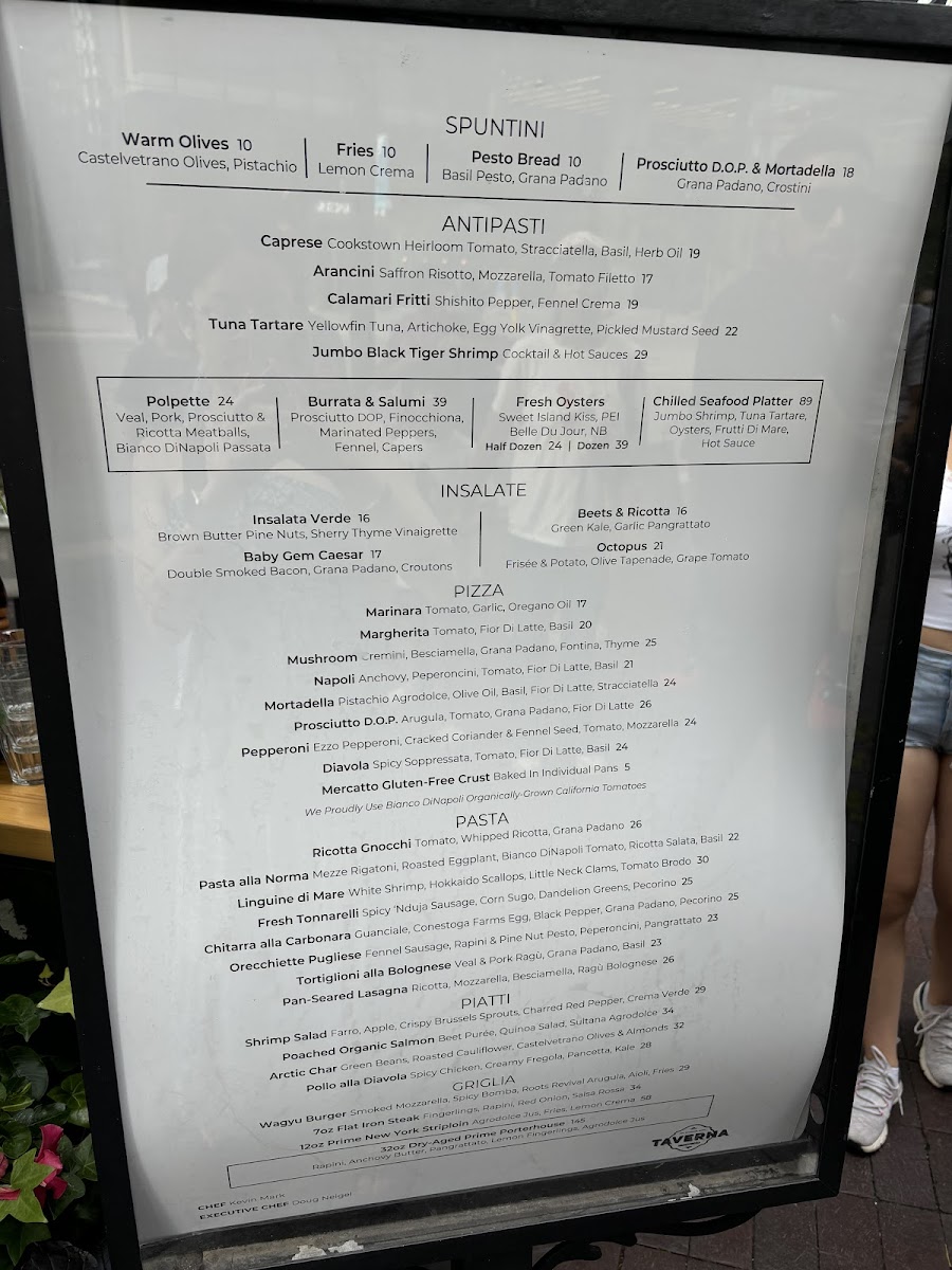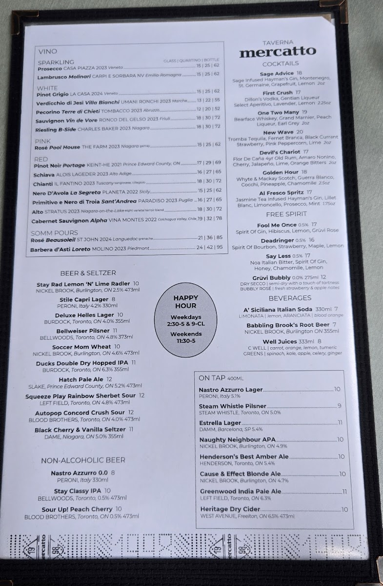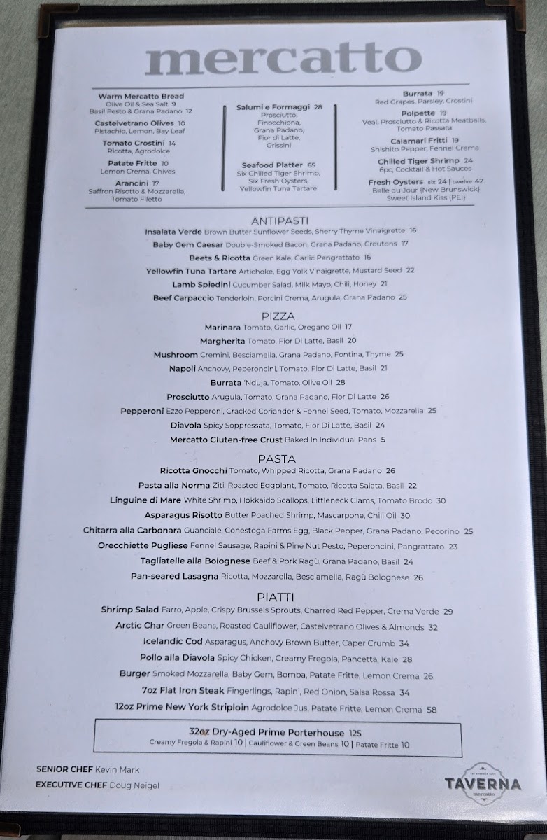 But it doesn't stop there; Taverna Mercatto also serves artisanal pizzas like the Margherita Pizza, where the tangy tomato, creamy fior di latte, and fresh basil come together in perfect harmony for CA$20.00. And if you're in the mood for something to share, their Warm Pesto Bread with basil pesto is a must-try delicacy at just CA$12.00, delivering comfort and satisfaction in every bite.